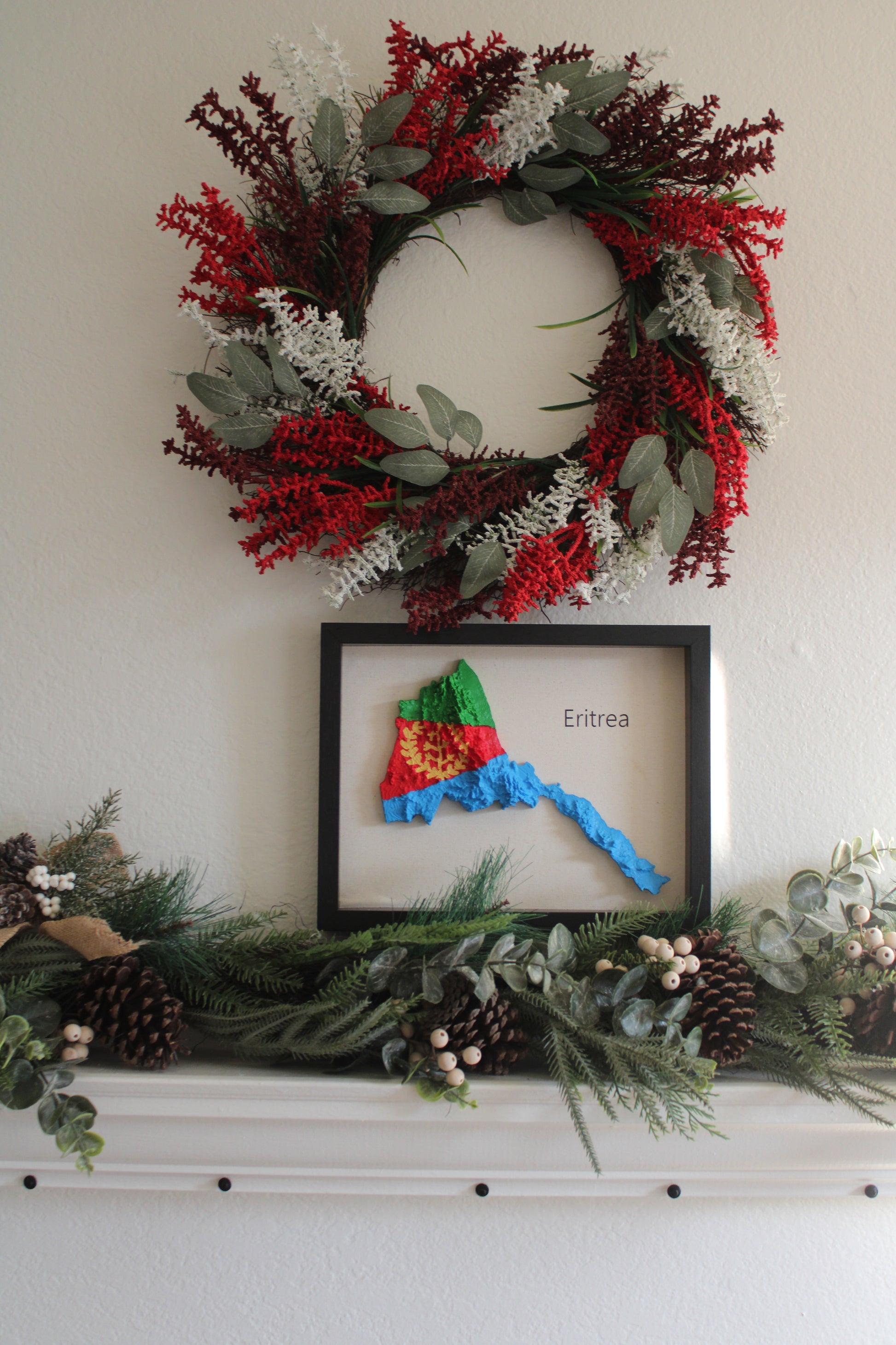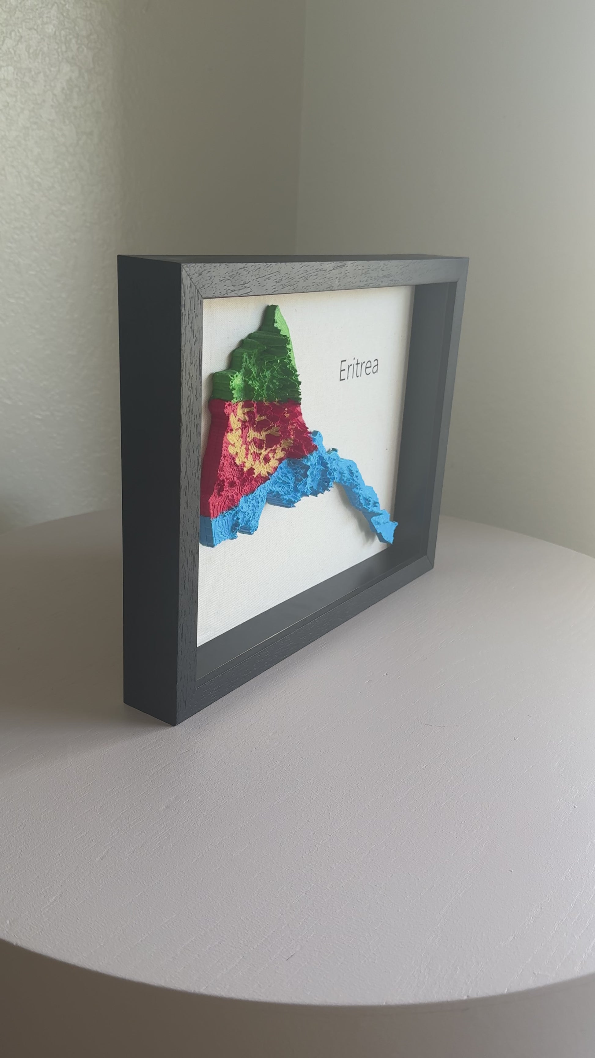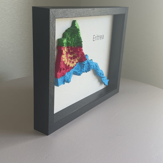 View the mountains, plains, and landscape of Eritrea in this stunning 3-dimensional elevation model painted with the Eritrean flag. You can hang this scientific work of art on a wall or perch the model on a mantle or dresser. Either way you'll feel inspired every time you gaze upon the beauty of Eritrea.